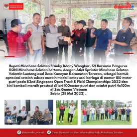 Pertemuan yang turut dihadiri Pengurus KONI Minahasa Selatan adalah bentuk Apresiasi kepada Atlet Sprinter Minahasa Selatan Wanita Kelahiran 14 Februari 2005 Valentin Lonteng asal Desa Kaneyan Kecamatan Tareran setelah sukses meraih medali emas usai berlaga di nomor 100 meter putri pada 82nd Singapore Open Track & Field Championships 2022. Turnamen itu digelar di Home of Athletics, Kallang Sports Centre, Singapura, kini kembali meraih prestasi di lari 100meter putri dan estafet putri 4x100m di Sea Games Vietnam baru-baru ini.