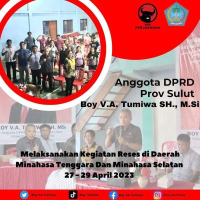 SULUT, MANADOLIVE.CO.ID– Anggota DPRD Provinsi Sulut Drs. Boy. V A Tumiwa BSC, SH, M.Si melaksanakan Kegiatan Reses di tiga lokasi berbeda yakni Kecamatan Tombatu Utara Di Desa Kuyanga kabupaten Mitra, pada hari kamis 27 April 2023, dan di Kabupaten Minsel, di laksanakan di Desa Pinaling Kecamatan Amurang Timur pada hari Jumat 28 April 2023, kemudian hari sabtu 29 April 2023, dilanjutkan di Desa Tumpaan.