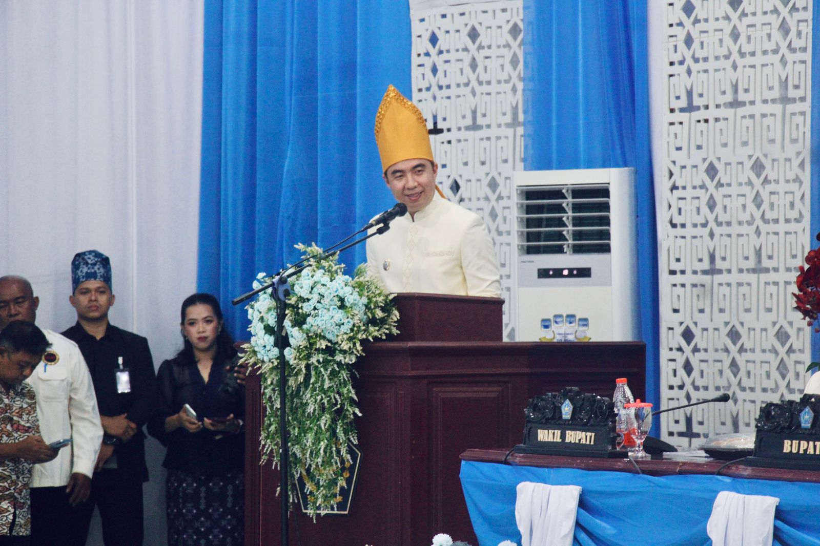 Turut hadir Sekretaris Daerah Kabupaten Kepulauan Sangihe, Melancton Harry Wolf, puluhan anggota DPRD, jajaran pimpinan organisasi perangkat daerah (OPD), para mantan Bupati Kepulauan Sangihe, Forkompinda serta sejumlah tamu undangan.