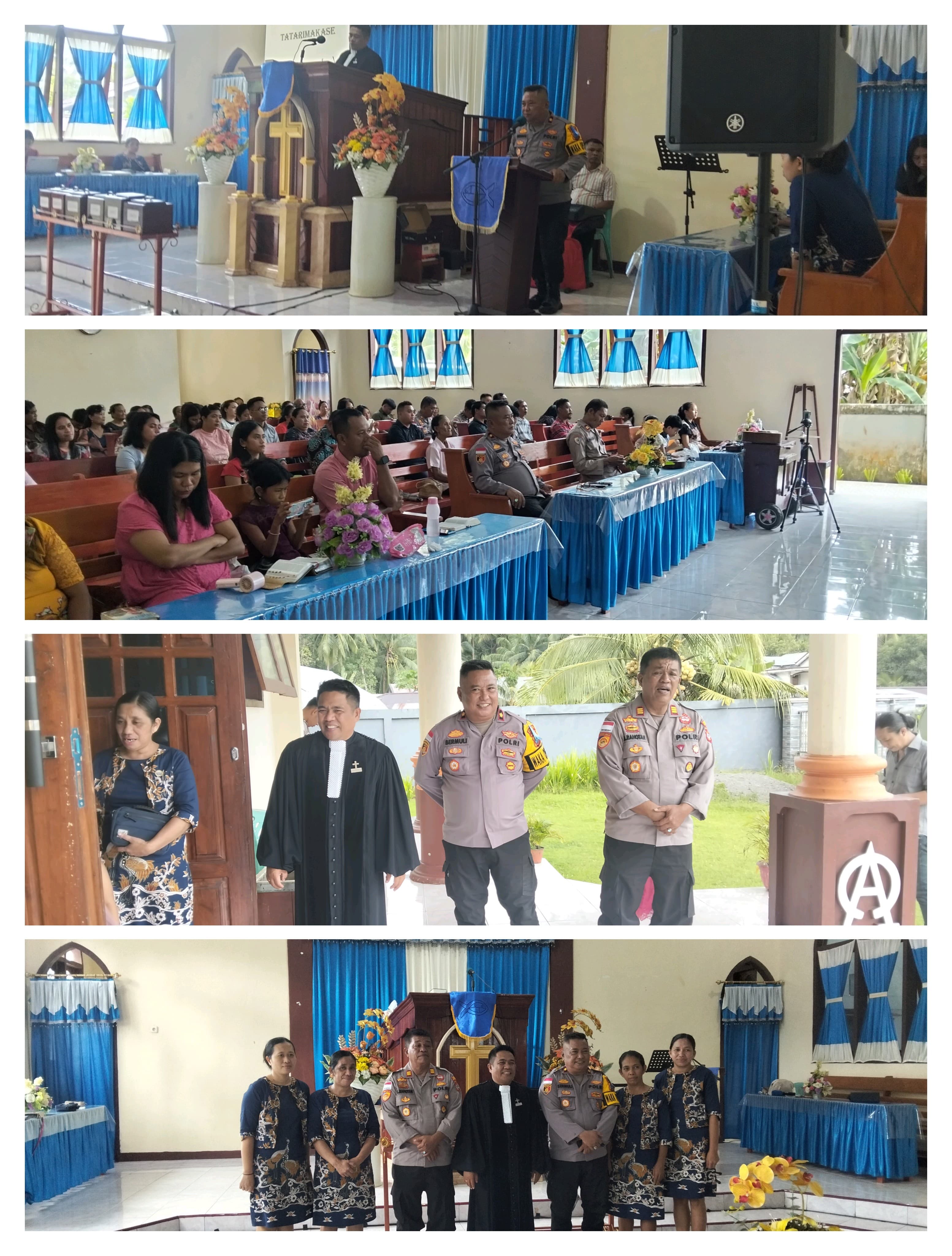 Ibadah ini turut dihadiri Wakapolres Kepulauan Sangihe, Kompol Arivalianto Bermuli, S.H., M.H., didampingi AKP Anderson Rehotan selaku Kasiwas Polres Sangihe, IPTU Thomas Pamasi, serta sejumlah personel Binmas.
