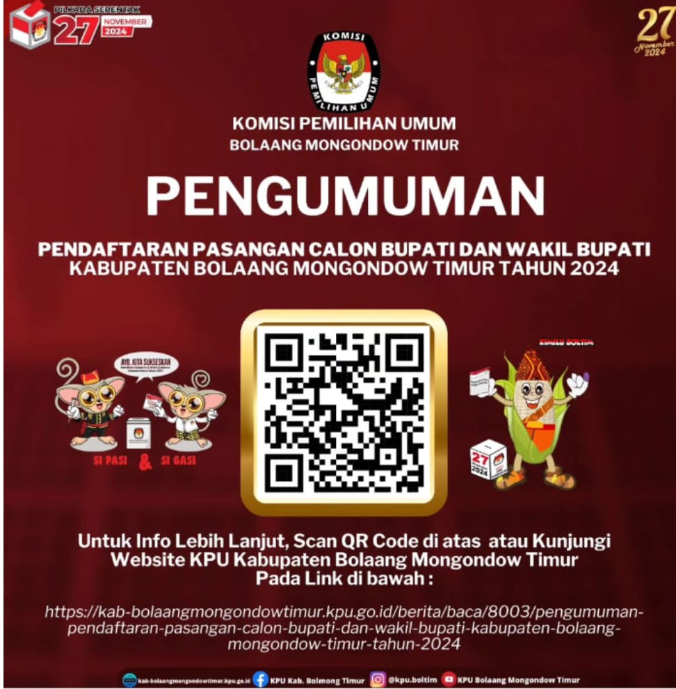 Seperti dalam surat resmi yang di umumkan KPU Kabupaten Bolaang Mongondow Timur (Boltim) yang tengah membuka tahapan pendaftaran bagi pasangan calon Bupati dan Wakil Bupati untuk Pilkada Boltim 2024.