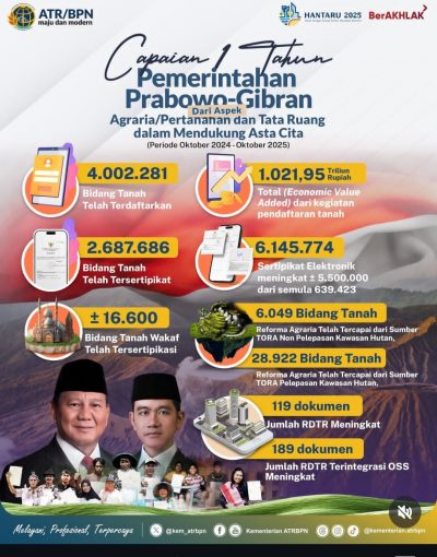 “Sesuai arahan Bapak Presiden Prabowo Subianto, Kementerian ATR/BPN bekerja untuk memastikan tanah dan ruang jadi instrumen pemerataan kesejahteraan rakyat. Setahun ini jadi fondasi penting untuk melangkah lebih cepat dan lebih kuat demi menciptakan keadilan sosial bagi seluruh rakyat Indonesia,” ungkap Wamen Ossy pada Senin, 20 Oktober 2025.