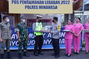 MINAHASA, MANADOLIVE. CO. ID—Bulan Suci Ramadhan ini, Kapolres Minahasa AKBP Tommy Bambang Souissa, SIK, Disertai Ketua Bhayangkari Cabang Minahasa Ny.Melda Souissa, beserta pengurus cabang Bhayangkari membagikan takjil berupa bingkisan di setiap Pos Pam Operasi Ketupat 2022 serta kepada puluhan masyarakat bertempat di kelurahan Kampung Jawa Tondano ,Kabupaten Minahasa ,Jumat sore (29/04/2022).