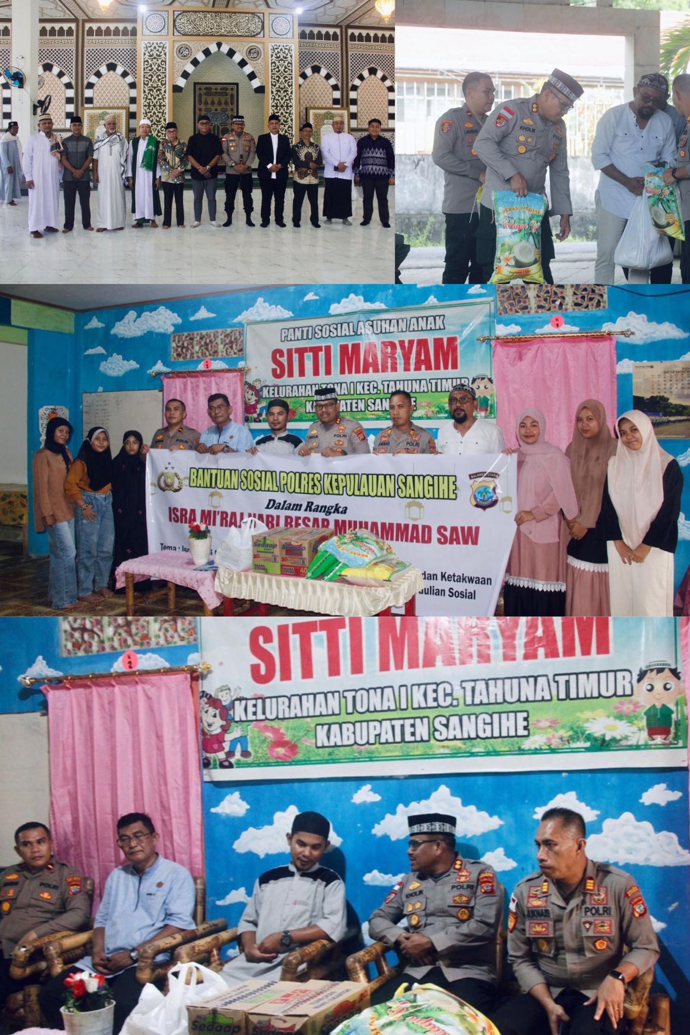 Usai pelaksanaan Jumat Keliling yang berakhir sekitar pukul 12.35 WITA, Kapolres Kepulauan Sangihe melanjutkan kegiatan dengan penyerahan bantuan sosial secara simbolis dalam rangka memperingati Isra Mi’raj Nabi Muhammad SAW 1447 Hijriah. Kegiatan tersebut berlangsung di Panti Asuhan Sitti Maryam, Kelurahan Tona I, Kecamatan Tahuna Timur.