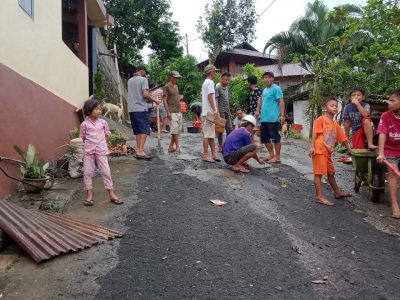 MITRA, MANADOLIVE.CO.ID-Sejumlah pemuda Karang Taruna Kawiwi Tosuraya Barat dan warga Tosuraya Barat, Kecamatan Ratahan, Kabupaten Minahasa Tenggara (Mitra) bergotong royong memperbaiki jalan yang rusak secara swadaya.