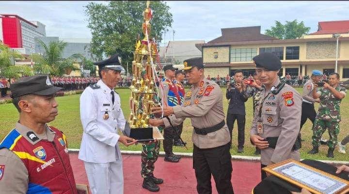 Lurah Dua Sudara Lucky Runtuwene didampingi Kapolres Bitung menerima langsung penyerahan piala juara 1 lomba 3 pilar.