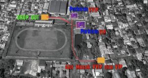 Adapun rute pawai selebrasi paskah Pemuda Sinode GMIM sesuai denah dimulai dari Stadion Dua Sudara ke arah simpang TK Pembina Manembo Nembo Atas belok kiri masuk Perum Citra Anugerah keluar Perum Buayaki turun Terminal Tangkoko bergerak simpang patung kuda menuju jalan belakang AMI kemudian lurus ke depan gereja Pniel Manembo Nembo melewati gereja Katolik Maria Para Rasul belok kiri jalan kantor Lurah Manembo Nembo terus simpangan naik jalan depan Samsat dan berakhir lagi di Stadion Dua Sudara.Guls