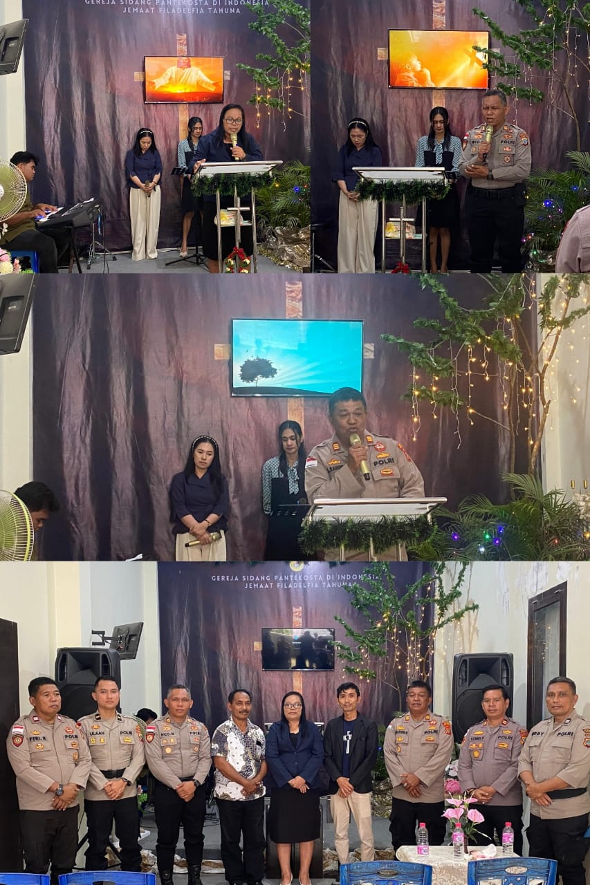 Pamapta I IPDA Recky Ulaan, Kanit Turjawali Sat Samapta AIPTU Feri Katiandagho, Kanit Provost Si Propam AIPTU A. Mangantare, personel Humas Polres Kepulauan Sangihe, serta majelis dan jemaat Gereja GSPDI Filadelfia Tahuna. ( gustaf)