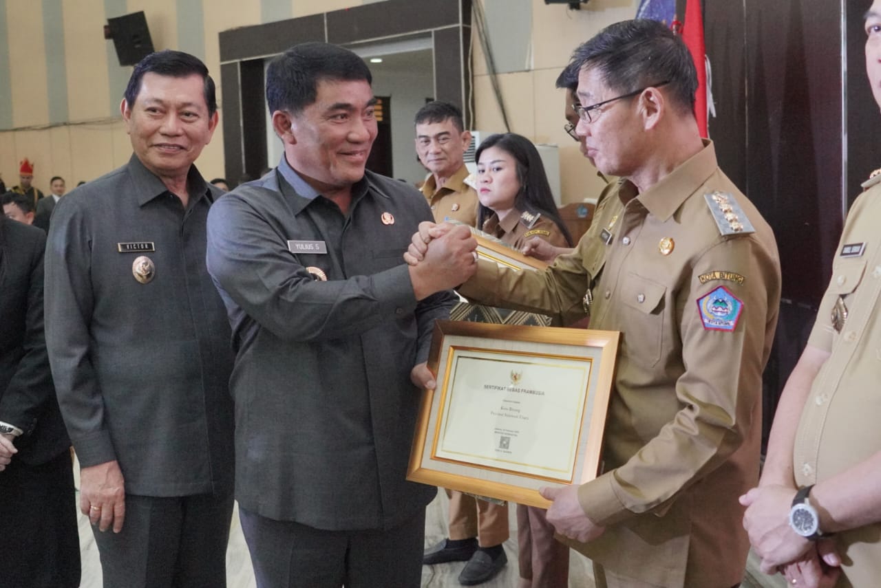 Wujud penghargaan tersebut diberikan langsung Gubernur Sulawesi Utara Mayjen Purnawirawan Yulius Selvanus kepada Wali Kota Bitung Hengky Honandar, SE.