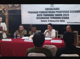 ” Sosialisasi ini merupakan kesempatan eksekutif dan legislatif, Jadi prosesnya itu dia masuk ke pintu itu dulu baru terjadi pembahasan sampai pada rancangan untuk menyampaikan tentang hal tersebut ke masyarakat,” tuturnya dalam Sosialisasi Program Pembentukan Peraturan Daerah Kota Tomohon Tahun 2004, di Kecamatan Tomohon Utara, Selasa (14/11-2023).