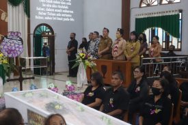 Walikota Tomohon Caroll Joram Azarias Senduk, S.H. bersama Ketua TP-PKK Kota Tomohon Ibu drg. Jeand’arc Senduk-Karundeng menghadiri Ibadah pemakaman Almarhumah Magdalena Palit di Gedung Gereja Jemaat GMIM Bukit Sion Rurukan.