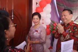TOMOHON, MANADOLIVE.CO.ID- Walikota Tomohon Caroll Joram Azarias Senduk, S.H. bersama Ketua TP-PKK Kota Tomohon drg. Jeand’arc Senduk-Karundeng menghadiri ibadah pentahbisan/peresmian pastori satu Jemaat GMIM Elim Pinaras Wilayah Tomohon Tiga, Minggu 16/04/2023