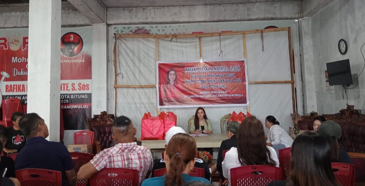 Bitung,MANADOLIVE.CO.ID- Dalam rangka memasuki masa persidangan kedua tahun pertama tahun sidang 2024-2025, anggota DPRD Kota Bitung daerah pemilihan Kecamatan Matuari dan Kecamatan Ranowulu dari fraksi PDIP Rafika Rifka Papente, hari Rabu 9 April 2025 melaksanakan kegiatan reses di Lingkungan 5 RT 2 Kelurahan Manembo Nembo Atas.